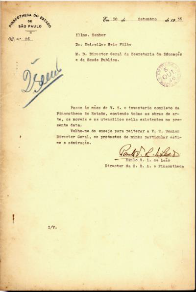 Figura 10. [Ofício do Secretário da Educação e da Saúde Pública para o Diretor da Pinacoteca, Paulo Leão, em 1936] Fundo BR SPAPESP SEDUC – Secretaria da Educação do Estado de São Paulo, Subfundo 10G12 – Pinacoteca do Estado, Inventários da Pinacoteca do Estado (1936-1939).