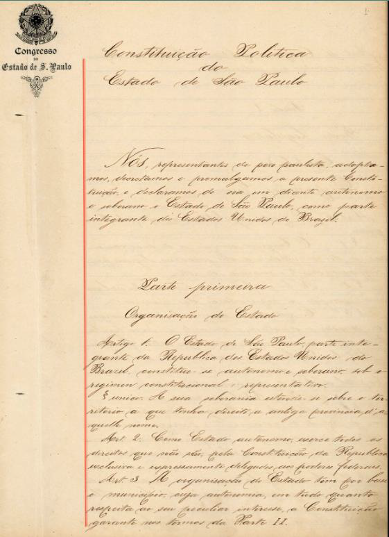 Figura 13. [Constituição do Estado de São Paulo, Lei nº 15, de 11 de novembro de 1891] Fundo BR SPAPESP SEINT – Secretaria do Interior do Estado de São Paulo.
