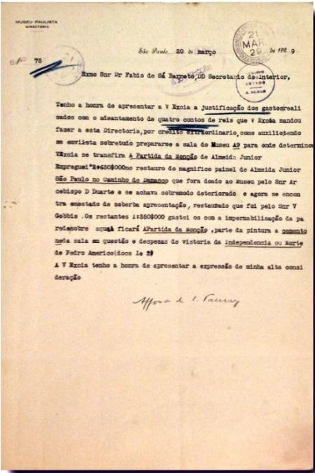 Figura 7. [Ofício do Secretário do Interior endereçado ao Diretor do Museu Paulista, Affonso Taunay, em 1929]