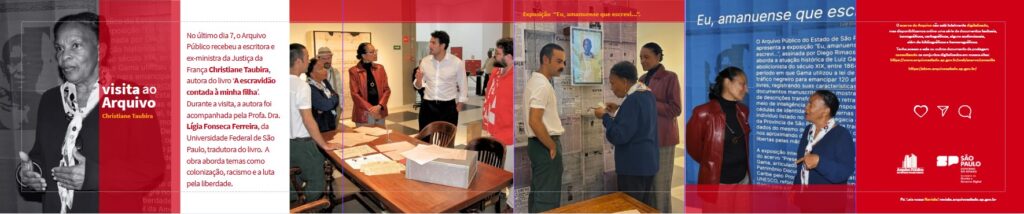 No dia 24 de agosto de 2025, a equipe do Arquivo, junto com o artista da mostra, receberam a visita de Christiane Taubira, escritora e ex-ministra da Justiça da França, autora do livro ‘A escravidão contada à minha filha’. Durante a visita, a autora também foi acompanhada pela Profa. Dra. Lígia Fonseca Ferreira, da Universidade Federal de São Paulo, tradutora do livro. A obra aborda temas como colonização, racismo e a luta pela liberdade.